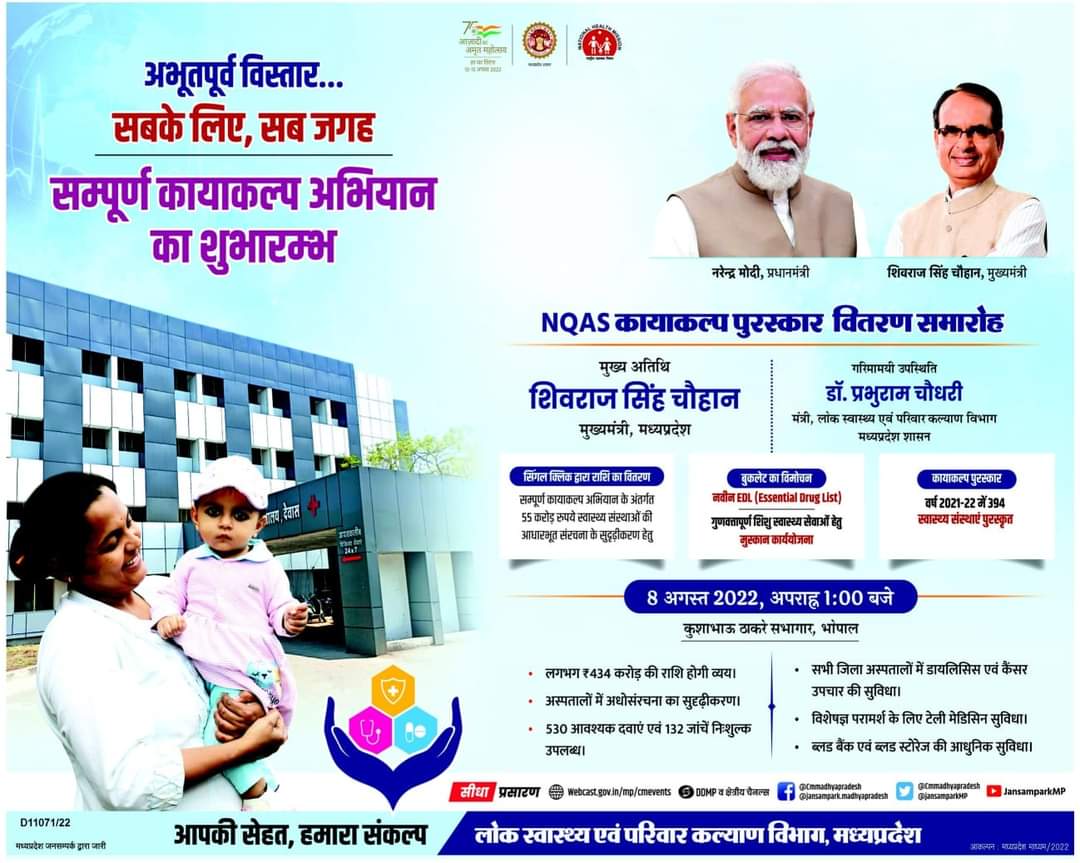 मुख्यमंत्री श्री Shivraj Singh Chouhan ने कुशाभाऊ ठाकरे सभागार भोपाल में #MissionSampoornKayakalp का शुभारंभ किया। मुख्यमंत्री श्री चौहान ने प्रदेश की कुल 1625 स्वास्थ्य संस्थाओं को सामान्य मरम्मत व विशेष मरम्मत के लिए कुल ₹66.05 करोड़ की राशि का सिंगल क्लिक से वितरण किया। सीएम श्री चौहान द्वारा अत्यावश्यक दवा सूची पुस्तिका ‘मुस्कान’ का विमोचन भी किया गया। सरकारी अस्पतालों में दी जाने वाली आवश्यक दवाओं की सूची 295 से बढ़ाकर 530 दवाएं कर दी गई हैं। इसमें कैंसर जैसी गंभीर बीमारी की दवाएं भी शामिल की गई हैं।