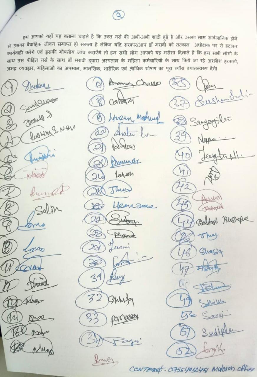 पत्र में कहा गया है, “डॉ. मरावी ने हाल ही में अपने चेंबर में एक नर्स के साथ बलात्कार करने का प्रयास किया। हमारी इस सहकर्मी की हाल ही में शादी हुई है। इसके अलावा पत्र में कहा गया की – डॉ. मरावी रात के वक्त हाफ पेंट पहनकर शराब के नशे में नर्सों के चेंजिंग रूम में अचानक घुस आते हैं और अश्लील बातें करते हैं। नर्सों ने आरोप लगाया है कि वो कभी उनकी छुट्टी मंजूर करते समय, कभी जॉइनिंग के दौरान अपने चेंबर में बुलाकर गंदे तरीके से छूते हैं और गंदी बातें करते हैं।