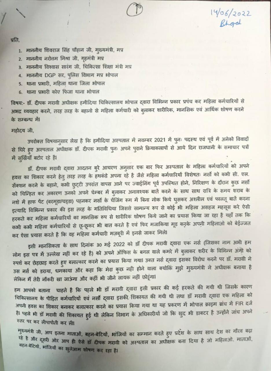 भोपाल : मध्यप्रदेश की राजधानी भोपाल के सबसे बड़े सरकारी अस्पताल {गांधी मेडिकल कॉलेज} से बड़ा और चौका देने वाला मामला सामने आया है, जहां 52 नर्सों ने अस्पताल के अधीक्षक डॉक्टर दीपक मरावी पर यौन दुराचार का गंभीर आरोप लगाया है। पीड़ित नर्सों ने इसको लेकर मुख्यमंत्री शिवराज सिंह चौहान, गृह मंत्री नरोत्तम मिश्रा, चिकित्सा शिक्षा मंत्री विश्वास सारंग के अलावा डीजीपी सुधीर सक्सेना को पत्र लिखा है।