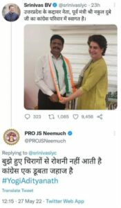 बीवी श्रीनिवास के इस ट्वीट पर मध्यप्रदेश के नीमच कलेक्टर ने अपनी प्रतिक्रिया दी। नीमच कलेक्टर ने ट्वीट करते हुए लिखा की – बुझे हुए चिरागों से रोशनी नहीं आती है कांग्रेस एक डूबता जहाज है।