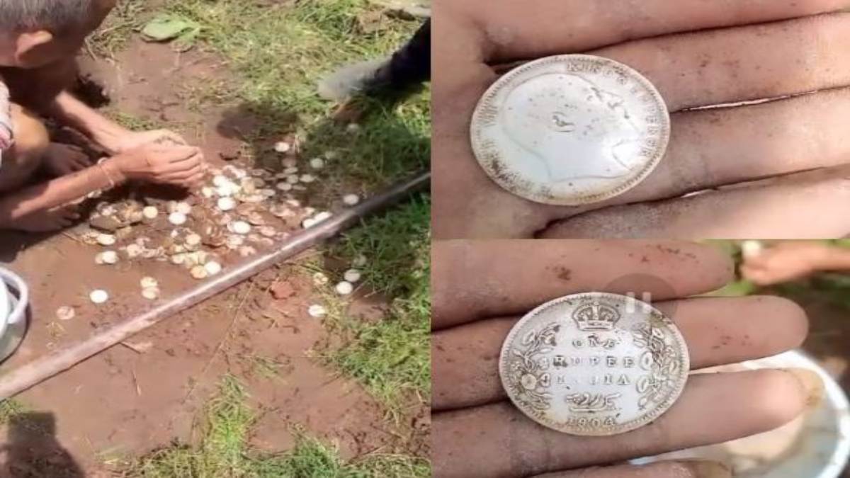 नरसिंहपुर। मध्यप्रदेश के नरसिंहपुर के लोकीपार में एक किसान को खेत में चांदी के सिक्के मिले हैं। जिनपर 1904 और विक्टोरिया की तस्वीर अंकित है। फिलहाल पुलिस ने पंचनामा तैयार किया है। आज दोपहर 12.30 बजे पुरातत्व विभाग की टीम मौके पर पहुंचकर जांच करेगी। जिले का एक किसान अपने खेत में बने मंदिर के पास टीन सेट का निर्माण कर रहा था। इसी दौरान पिलर के लिए गड्ढे हो रहे थे तभी एक गड्ढे में धातु की आवाज सुनाई दी और जब उसे देखा गया तो उसमें सिक्कों से भरा एक मिट्टी का मटका मिला। जिसमें रानी विक्टोरिया के शासनकाल के सन 1904 के चांदी के सिक्के भरे हुए थे।