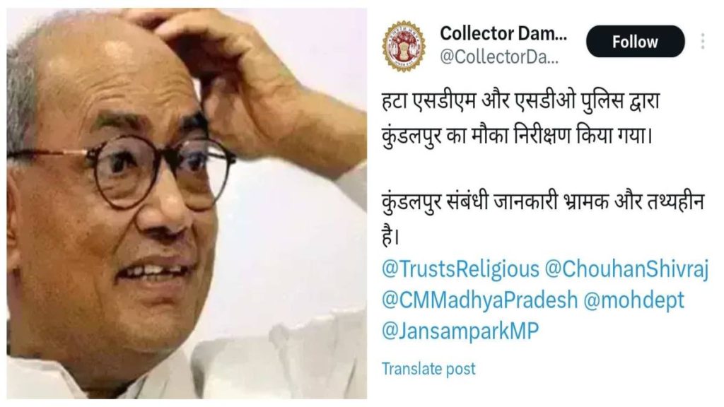 वहीं दिग्विजय सिंह के ट्वीट के बाद दमोह जिला प्रशासन ने भी ट्वीट कर मामले में स्पष्टीकरण दिया है। जिला प्रशासन ने दिग्विजय के ट्वीट को तथ्यहीन और भ्रामक बताते हुए लिखा “हटा एसडीएम और एसडीओ पुलिस द्वारा कुंडलपुर का निरीक्षण किया गया, कुंडलपुर संबंधित ट्विटर पर दी गई जानकारी भ्रामक और तथ्यहीन है। वहीं मुख्यमंत्री शिवराज सिंह चौहान को भी ट्वीट कर दमोह एसपी और कलेक्टर ने जानकारी दी।