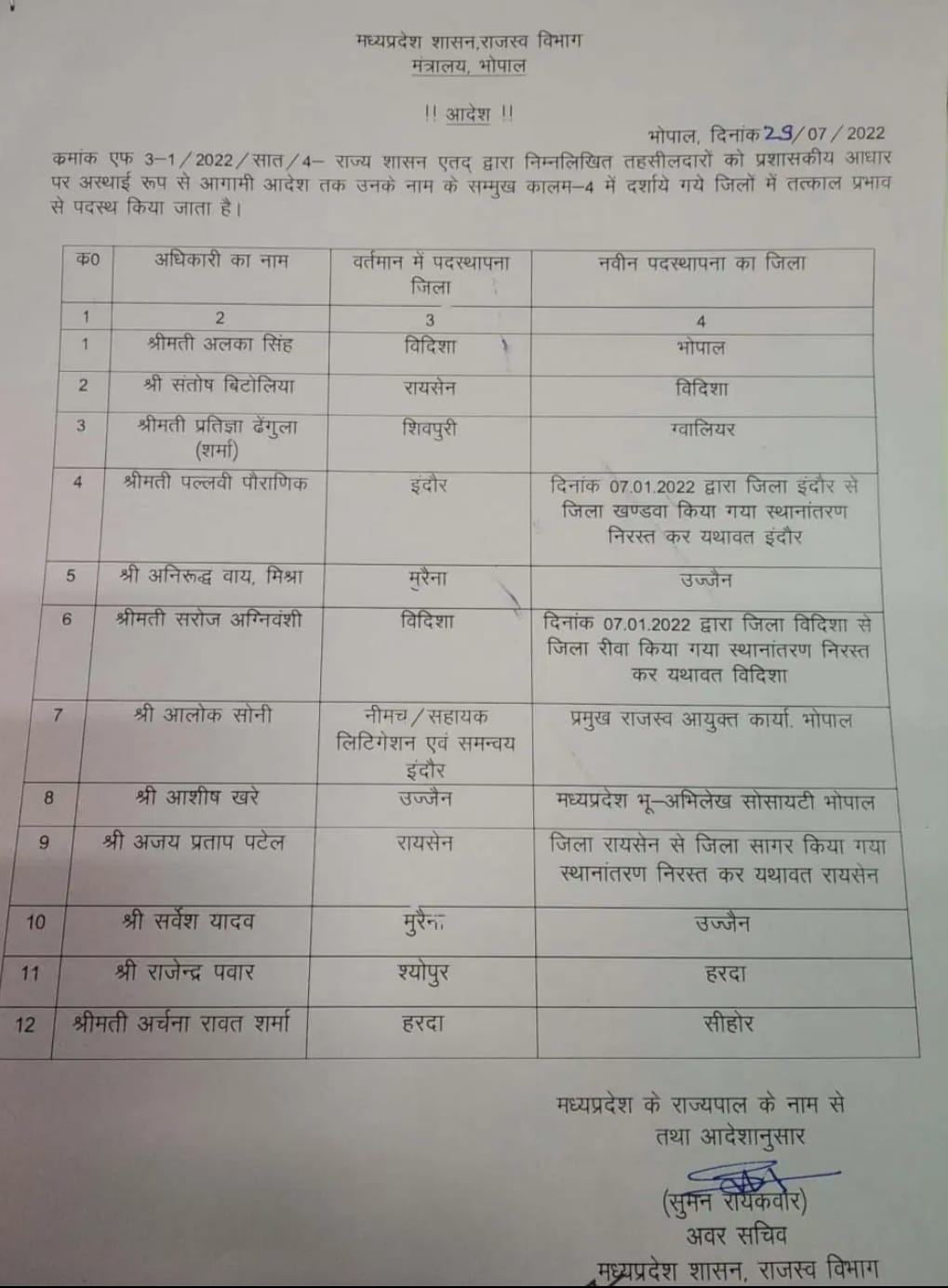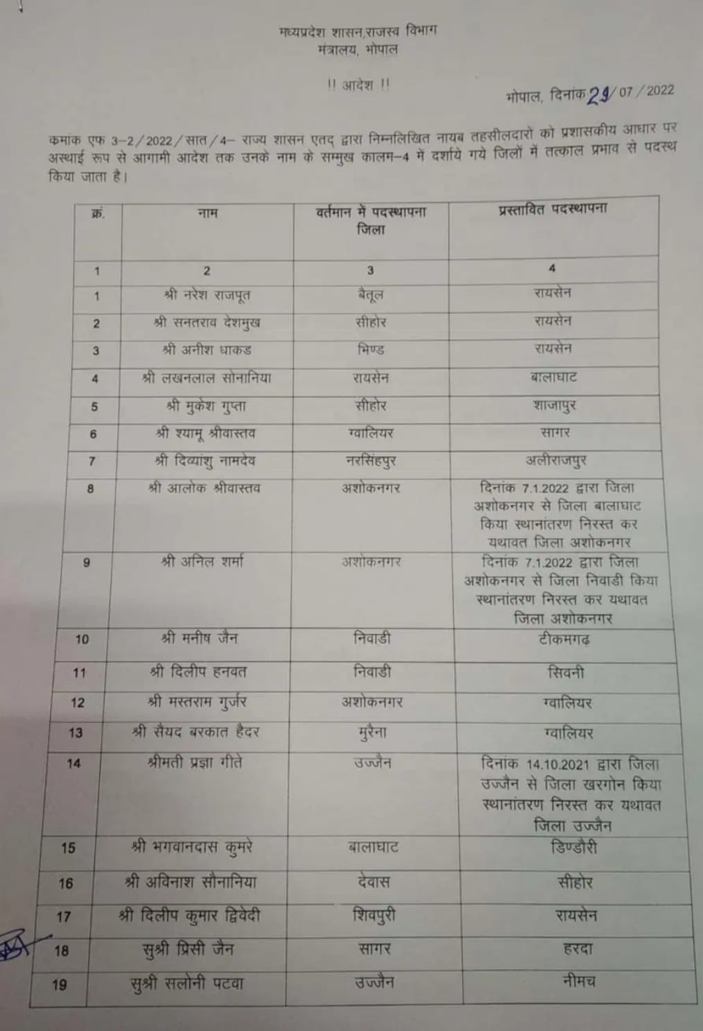 MP : तबादलों का दौर जारी, अब तहसीलदारों और नायब तहसीलदारों को किया यहां से वहां