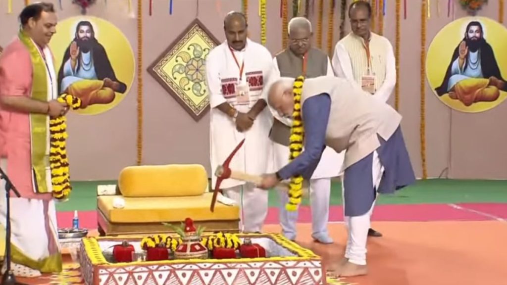 सागर। प्रधानमंत्री नरेंद्र मोदी आज मध्य प्रदेश के सागर दौरे पर हैं। जहां उन्होंने संत रविदास मंदिर का भूमिपूजन किया। इस मंदिर का निर्माण 100 करोड़ से अधिक की राशि से 11 एकड़ भूमि पर किया जाएगा। इस विशाल और भव्य मंदिर में संग्रहालय पुस्तकालय संगत सभाखंड सहित अनेक संरचनाएं मौजूद रहेंगी। इसके अलावा पीएम मोदी ने ढाई हजार करोड़ की लागत से कोटा बीना के बीच 288 किलोमीटर रेल मार्ग पर अतिरिक्त लाइन (बीना, गुना, कोटा) और 1600 करोड़ की लागत से 96 किलोमीटर सड़क परियोजना का भी भूमिपूजन किया। इस दौरान राज्यपाल मंगूभाई पटेल और सीएम शिवराज सिंह चौहान सहित कई मंत्री, नेता और पदाधिकारी मौजूद रहे।